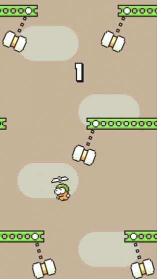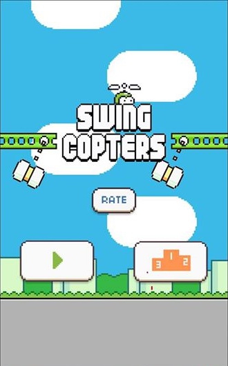 在《 Flappy Bird 》的風潮過後,其作者 Dong Nguyen 的最新作品《 Swing Copters 》終於在 App Store 推出了。本作中將《 Flappy Bird 》橫向過關玩法改為垂直上下,並將難度拉高數倍,玩家每一次點擊螢幕,都可以改變左右晃動的規律,此外再加上關卡中固定搖擺的障礙物,想通過第一道障礙應該都是十分困難的一件事。