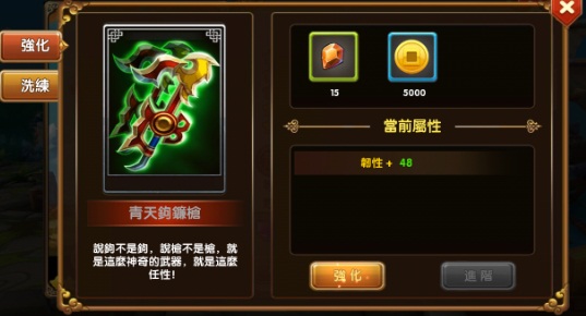 而神兵系統只要每強化一次便可以增加一種能力屬性在持有的武將身上。而當神兵進化到一定的等級時,便可以進階成更高強的武器。只要神兵進階到紫色時,便可以利用洗煉來加強武將的專精能力。