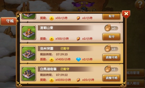 只要在劇情關卡中推過每一個地區章節的主城,便能夠派將領駐守攻下的城池。而每個城池滿員最多可讓五名英雄進駐,可選擇駐守一小時,四小時或八小時來獲得城池中的資源。也因此當你推過的城池更多更高級時,就可以獲得更多的資源,但相對的就得分派陣營中的更多的武將英雄來駐守城池。所以不用擔心太多將領無事可做,只怕不夠將領來駐守更多的城池。所以陣中的武將除了隨時候傳上陣出兵之外,閒暇時駐守城池增加稅收來為主公累積更多的財富,就能讓自己的軍容更加的精良強盛。