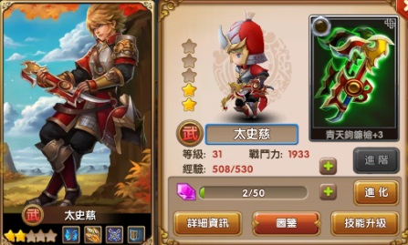 不過要注意的是,每個關卡玩家隊伍會愈來愈強,而且在戰鬥中陣亡的武將又不能再上陣。因此準備好主力隊伍和後援隊伍來交互應用支援也是一項非常考驗玩家腦力的挑戰;而技能的發動時機和英雄的陣容順序,更是決定著能否安然突破關卡的重要關鍵。