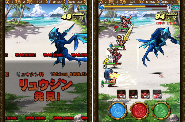 在本作的戰鬥中,要用 3 顆按鈕來進行「防禦」「一般攻擊」「特殊攻擊」。只要連續觸碰一般攻擊鈕就可以使出「連擊」,給予魔物大量損傷。而按住防禦鈕的話雖然可以防禦敵方的攻擊,不過若是配合魔物的攻擊動作來抓好時機按下防禦,就可以形成「完美防禦」而不受到任何傷害,是一個既單純又需要技術的遊戲系統。