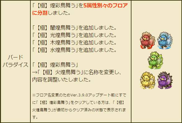 「【極】煌彩鳥舞う」五屬性 分別獨立。原【極】煌彩鳥舞う變更為【極】火煌彩鳥舞う