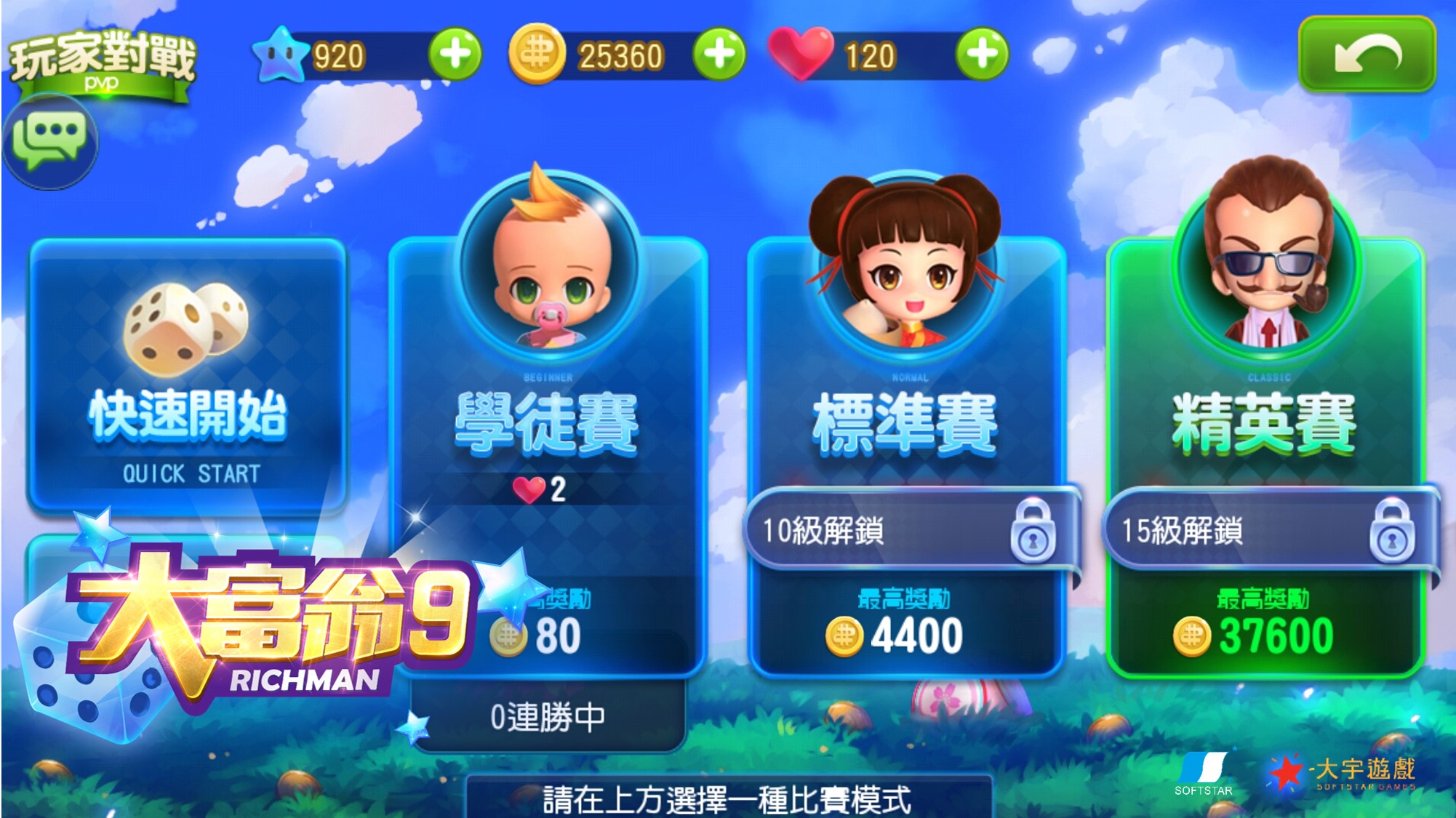 《大富翁》遊戲一直以來就是個與朋友一同歡笑嬉戲的遊戲,但當一個人想玩《大富翁》卻找不到人時就會覺得捶心肝,現在最新一代作品《 大富翁9 》提供了多種遊戲模式,讓一個人也可以快速找到網友一起暢玩,贏取遊戲的勝利金牌。在《 大富翁9 》當中一共分為四種遊戲模式,分別是「快速開始」、「玩家對戰」、「排行挑戰」與「生涯模式」等,這四種遊戲模式將透過不同的遊戲勝利方式來滿足各種玩家的遊戲需求。