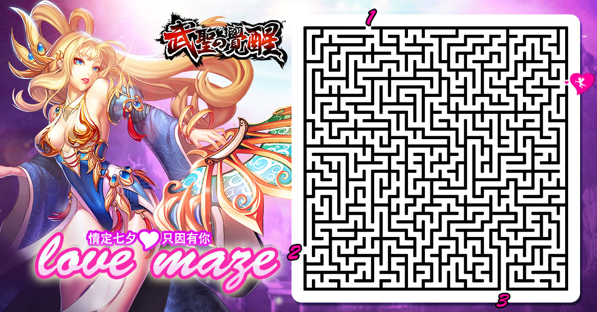 參加此活動的前提需要您關注我們《 武聖的覺醒 》Facebook粉絲頁。根據迷宮圖找到迷宮的出口。如果您找到了,答案按照一定的格式,在粉絲頁按照一定的格式回复我們的工作人員。參與即有獎。獎勵很豐厚哦。我們的工作人員會從回复的粉絲中挑選回答最快,答案最正確的兩位Fans,這兩個人各會得到抱枕一個喲!所有回答正確的fans均會得到 七夕 蜜方禮包。如果您沒有回答正確,運營團隊也會送上 七夕 鼓勵禮包的。當然,我們的粉絲頁會陸續推出很多或多,不要氣餒,多多參與,終有一天大獎就是您的。相關注意事項及活動規則,以粉絲頁運營團隊通知為準。歡迎關注我們的粉絲頁哦。 (迷宮圖參見下圖)找到了,記得粉絲頁回复喲。