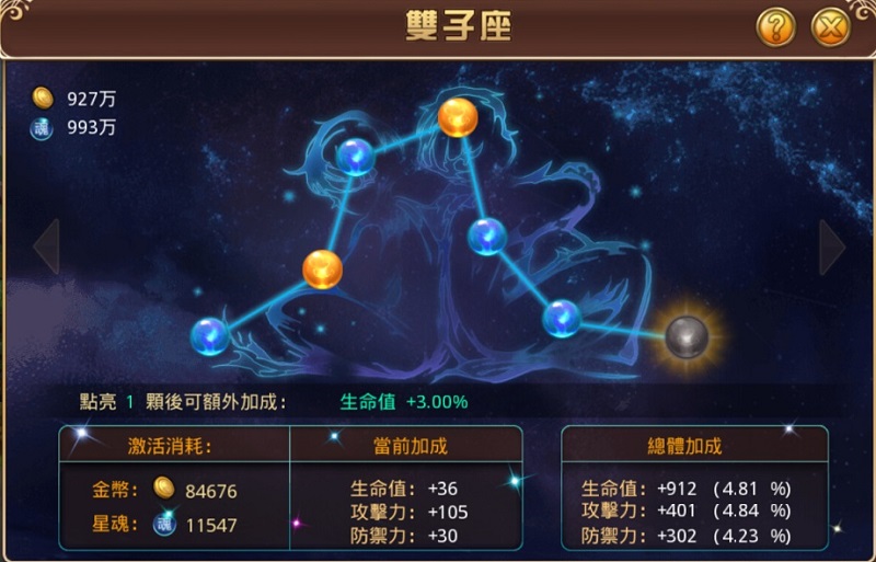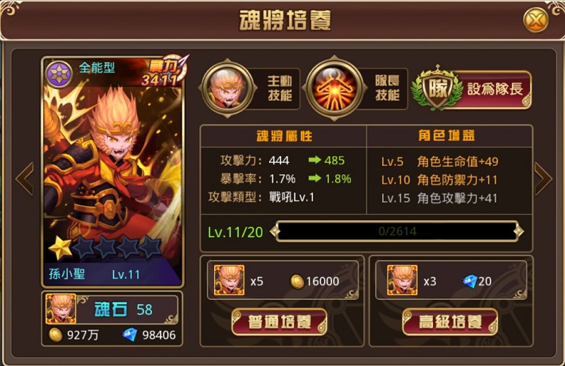 修煉時需消耗金幣和星魂,星魂是從每場戰鬥勝利後將獲得
