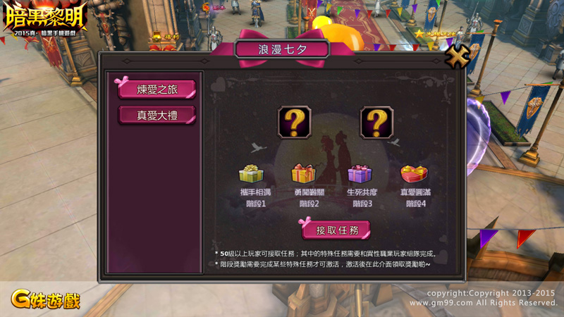 慶賀 七夕 節,G妹遊戲《 暗黑黎明 》新版本開啟的浪漫 七夕 新玩法,讓玩家開啟煉愛之旅。在浪漫 七夕 新玩法中,50等以上的玩家可接取相關任務,其中特殊任務需要和異性職業玩家組隊完成,完成不同階段的指定任務後玩家可相應獲得攜手相遇、勇闖難關、生死共度和真愛圓滿禮包。