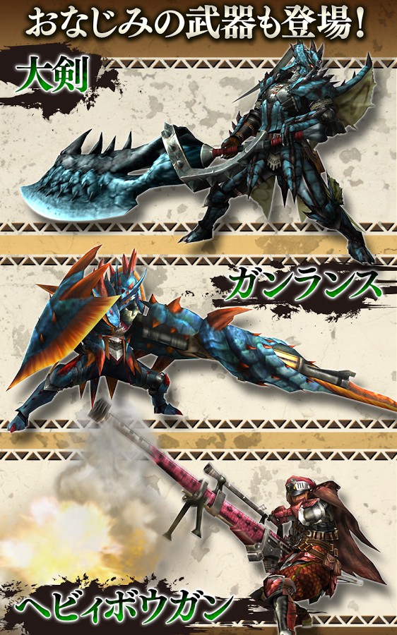 RPG 。玩家僅需使用單指即可操作各種武器與怪獸周旋,戰鬥時間也縮短、血條亦改為可視化,讓喜愛《魔物獵人》的玩家也能在空檔享受狩獵之樂。