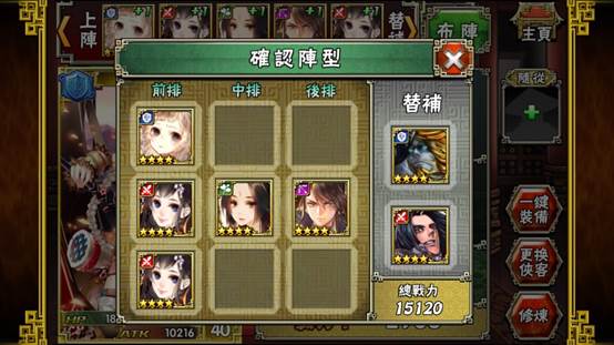 俠客各司其職,就最佳戰鬥位子,才能呈現完美戰鬥佈局。進行布陣時,分前中後三排,依各職業在戰鬥中的功能,派出五名俠客出戰。同時可另外安排二名俠客在替補位子隨時備戰。作戰時可選擇自動戰鬥功能,若改為手動攻擊,攻擊的時候可直接滑動角色還可進擊殺敵,角色離開原位向前攻擊擊敗敵人後會自動歸位。遊戲上方還有技能球槽,每個鏢師在獲得技能球後還可以釋放技能。