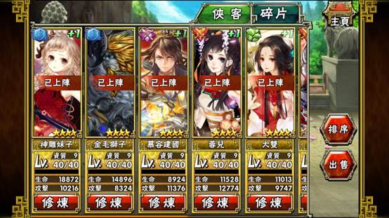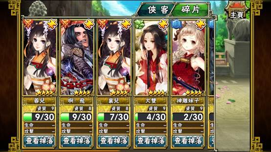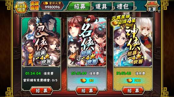 透過每天免費或是花費一定金額的元寶招募1-4星的俠客,或是經由通關副本、聚賢莊委任等玩法,取得各職業俠客的碎片。另外,遊戲中的分解系統,透過分解三星以上的俠客、武功以及裝備,可獲得俠魂等獎勵,累積俠魂,也可以兌換到四星俠客碎片。