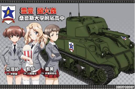 「雪曼 螢火蟲」是桑德斯大學附屬高中的主力使用車種,因為主炮炮身比一般戰車更長,可裝填更多的炮彈,所以「雪曼 螢火蟲」擁有非常優秀的火力,甚至能直接擊毀虎式戰車。而英國製造的「雪曼 螢火蟲」最為人所知的經典戰役是1944年盟軍反攻的「諾曼地登陸」,「雪曼 螢火蟲」是在諾曼地登陸中唯一可在正常距離中擊毀德軍戰車的英軍坦克,也是該役能獲勝的最大功臣。