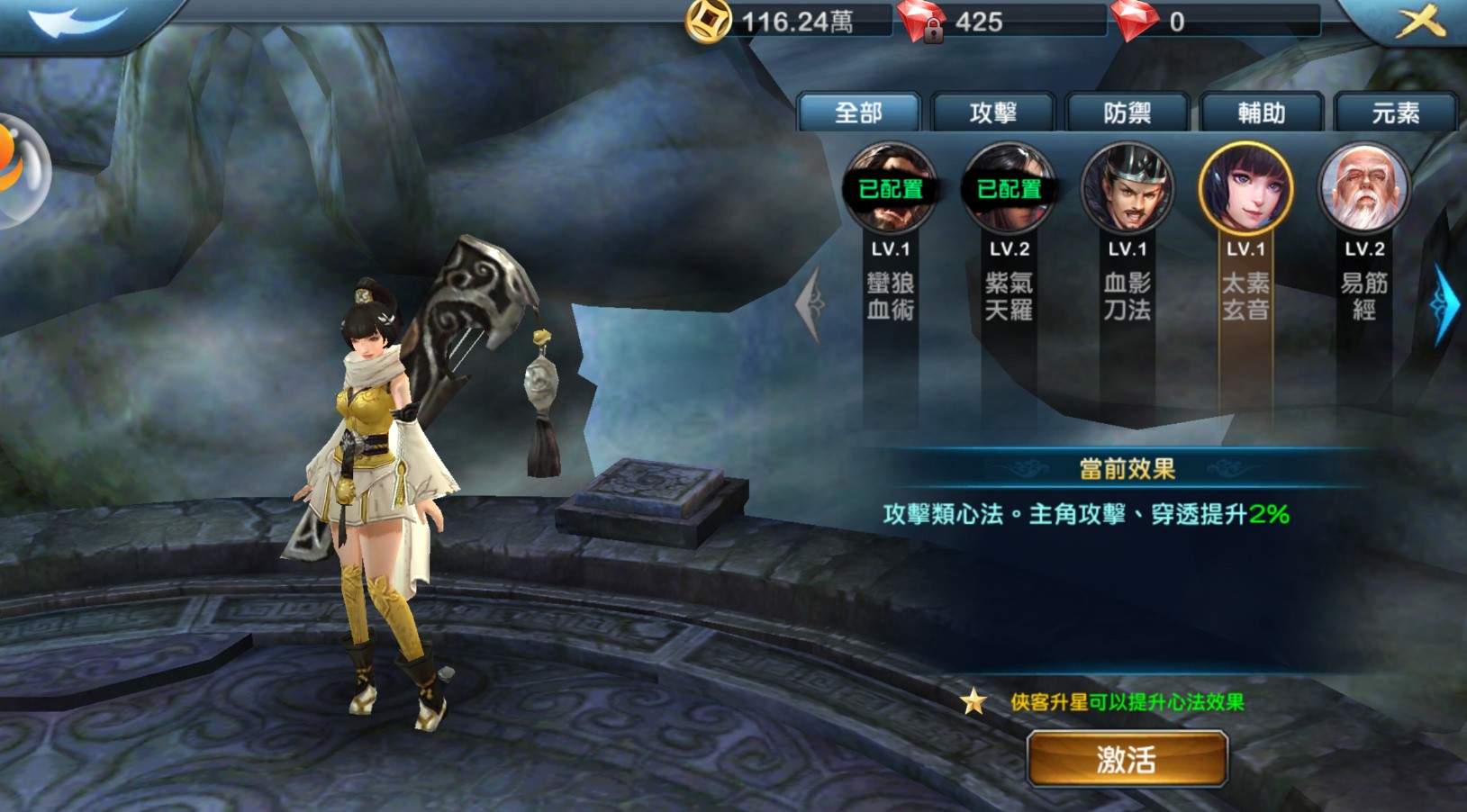 玩家在達到指定等級後會開啟心法系統,主角可以裝備四個不同的俠客來提升能力。