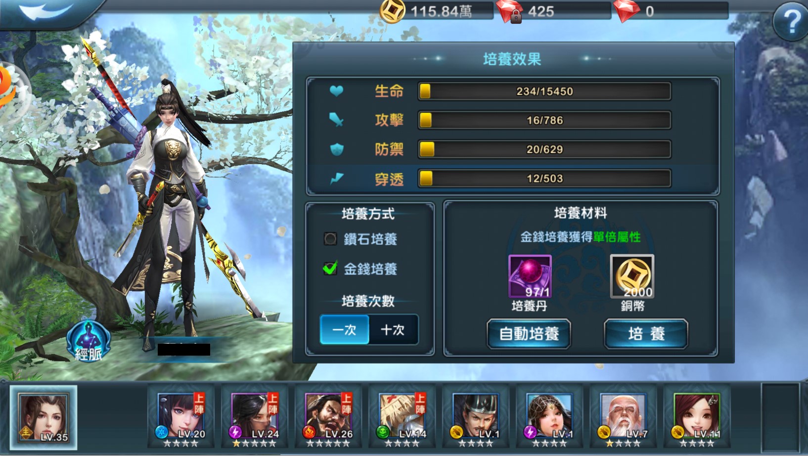 主角的角色除了可以更換技能以及更換裝備外,還可以透過培養來大幅提升角色能力。玩家可以選擇消耗「培養丹+銅幣」或是直接消耗「鑽石」來進行培養,可以隨機提升主角「生命」、「攻擊」、「防禦」、「穿透」數值。