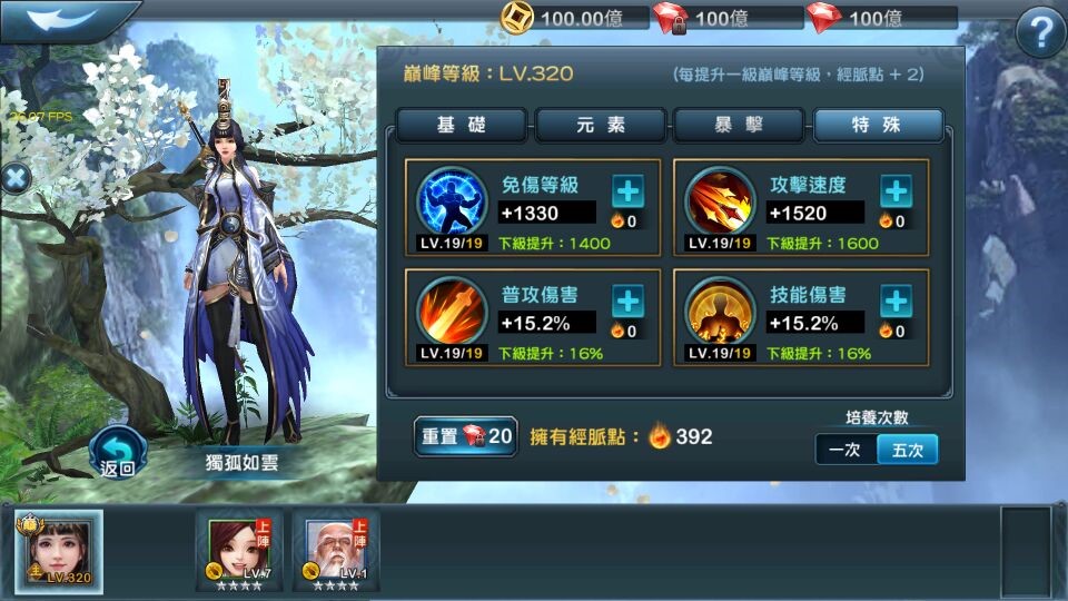 並在玩家角色等級80級後開啟巔峰等級,每提升一等顛峰等级可以獲得經脈點2點,玩家可以在培養的左下角處進入經脈培養介面。透過兩種培養方式,讓自己的角色更加強悍。