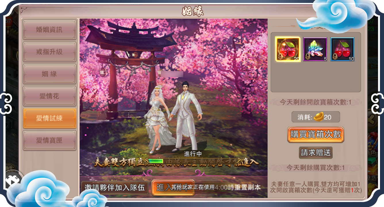 有人珍稀天長地久,也有人在乎曾經擁有,無論哪一種愛情,在遊戲中都值得你探尋。遊戲中57級開啟結婚系統,邂逅一段浪漫愛情就在此時此刻。維持一段感情,要落實到每日的行動中,與愛人種愛情花、組隊愛情試練、升級婚戒等都是不應錯過的增進甜蜜度的愛情互動!