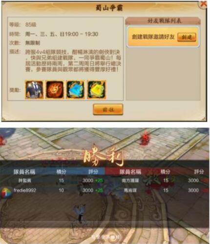 【蜀山爭霸】每賽季為期二週,分為「常規賽」與「決賽」。第一週「常規賽」時間為週一、三、五19:00-19:30,參加場次無上限但累計積分有上限限制;獲勝隊伍能得25積分,累積後可前往商店兌換獎勵可購買特殊真言石,而失敗方將被扣除25積分。此外,還增設特別獎勵「段位收益」與「安慰收益」,只要勇於挑戰的劍俠們,保證都能拿爽拿滿,獎不停!