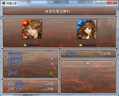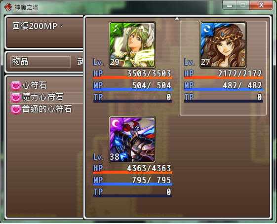 這邊說一下,因為RPG不像神魔之塔能夠透過消除心符石來回復血量,因此在戰鬥中血量的控制就顯得相當重要。不過玩家可以透過打小怪來獲取回復HP的道具或者用角色本身的技能消耗MP來回復HP