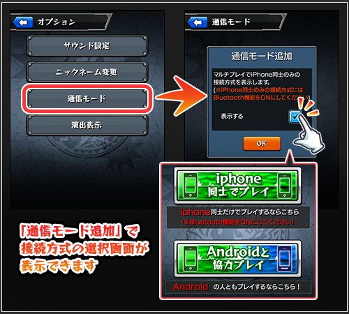 若玩家仍然想每次都選擇連線方式,可至「選項(オプション)」中的「通信模式(通信モード)」內將「表示」選項打勾即可。