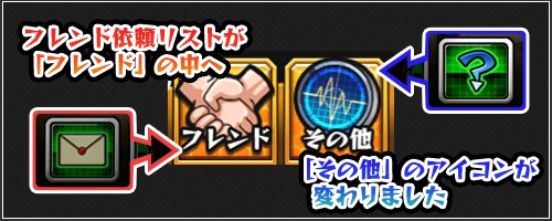 「好友委託清單(フレンド依頼リスト)」移至「好友(フレンド)」選單內。至今為止皆以「?」表示的「其他(その他)」選項獨立出來成為下方主選單按鈕。另外,先前主畫面與下方主選單皆有「冒險(クエスト)」按鈕,統一改為以主畫面中央的按鈕呈現。