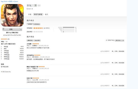 另外,這些遊戲的評論數也出現大幅度下降,《齊玩三國》的評分數就降到了68份,遠遠少於暢銷遊戲的正常水準。