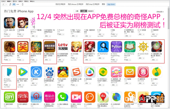 這次引起蘋果高度重視的刷榜活動發生於2014年12月1日,當天傳來iOS刷榜可以做到 App Store 免費榜 Top 10 的消息。12月4日,蘋果免費榜 TOP25 中出現一堆莫名其妙的APP,這些 App 疑似有人在測試刷榜。