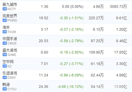 (6)日,美國股市中國 遊戲 股價出現集體下降現象,其中以暢游、樂逗等 遊戲 公司股價下跌逾 10 %,截至收盤狀況暢游重挫 16.12 %、樂逗大跌 8.09 %、空中網下跌3.71 %、盛大 遊戲 下跌 2.80 %、中國手游下跌 2.79 %及完美世界下跌 1.51 %。