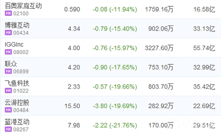 在整體下跌狀況之下,港股似乎也難逃這次跌幅狀態,藍港互動下跌 21.76 %、聯眾跌 17.65 %、雲遊控股跌 19.69 %、飛魚科下跌至 19.66 %、IGC 也跌下 15.97 %、博雅互動下降 15.4 %及百奧家庭互動跌 11.94 %,港股周一下午後繼續大規模跌幅現象,最高跌逾超近千點,到截止收盤狀況,恆生指數 25236 點,跌 827 點,跌幅為 3.18 %, 遊戲 股出現大幅度的下跌狀況。
