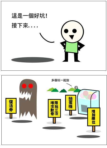之後 營利點 又更加進化... 變成了一種養坑的作法,什麼叫做養坑 ? 簡單來說就是創造玩家對課金的渴求,而且是一步步將他拉到坑裡面來。