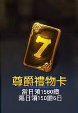 * 尊爵禮物卡(7天):購買後可立即獲得1580鑽石及超值高價虛寶(4級強化石x3、翅膀精華x5、鑽石抽獎券x1、橙色玄鐵x15、金幣15萬),還可於隔日開始連續6日領取150鑽石。