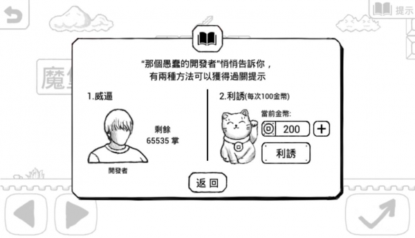覺得解謎很難?本作當然也很貼心的準備了提示功能啊…不過它也一樣虐人就是了。本作的提示功能分為「威脅」與「利誘」兩種,其中威脅就是呼巴掌呼到「那個愚蠢的開發者」受不了而給你提示(這其實是對玩家的手指造成威脅吧);而利誘則是直接用 100 金幣賄賂貓咪以獲取提示。說起來,利誘是簡單多了,而玩家每日登入(?)都能夠領取 100 金幣,若想要額外的金幣就必須付費購買~不過聽說還能藉由某種特殊方法來獲得額外的 100 金幣,至於你信不信?我反正是信了。