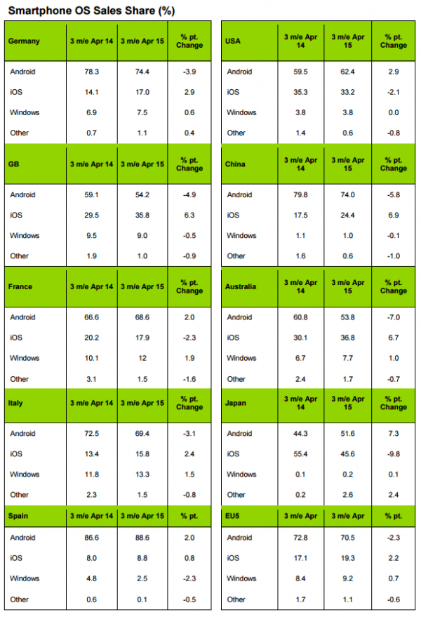 根據Kantar Worldpanel最新公佈近三個月(截至2015年5月)智能手機全球銷量報告,WP系統在全球範圍內有喜有憂。WP系統在歐洲市場的反響最好,尤其在英國和義大利,在EU5的市場佔有率從上個月的9.2%繼續上升到9.5%。不過在國內市場Windows系統的市場占比為1.0%,相比較去年同期的1.1%下降了0.1%。